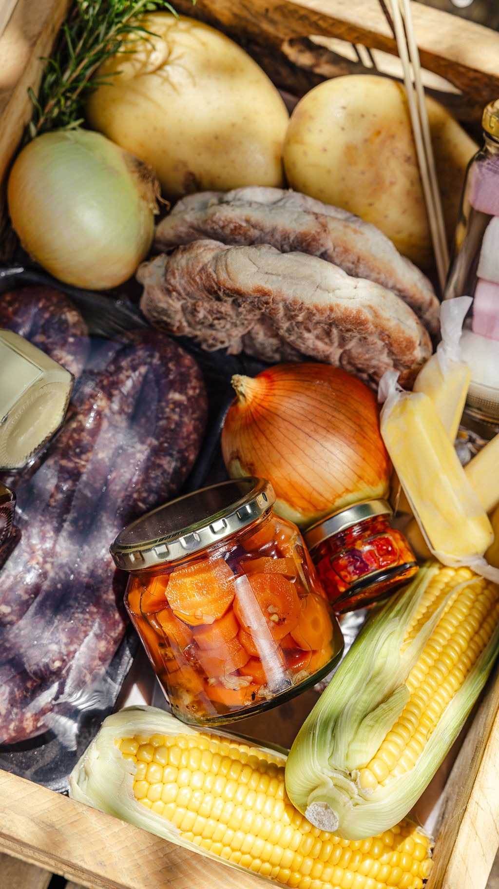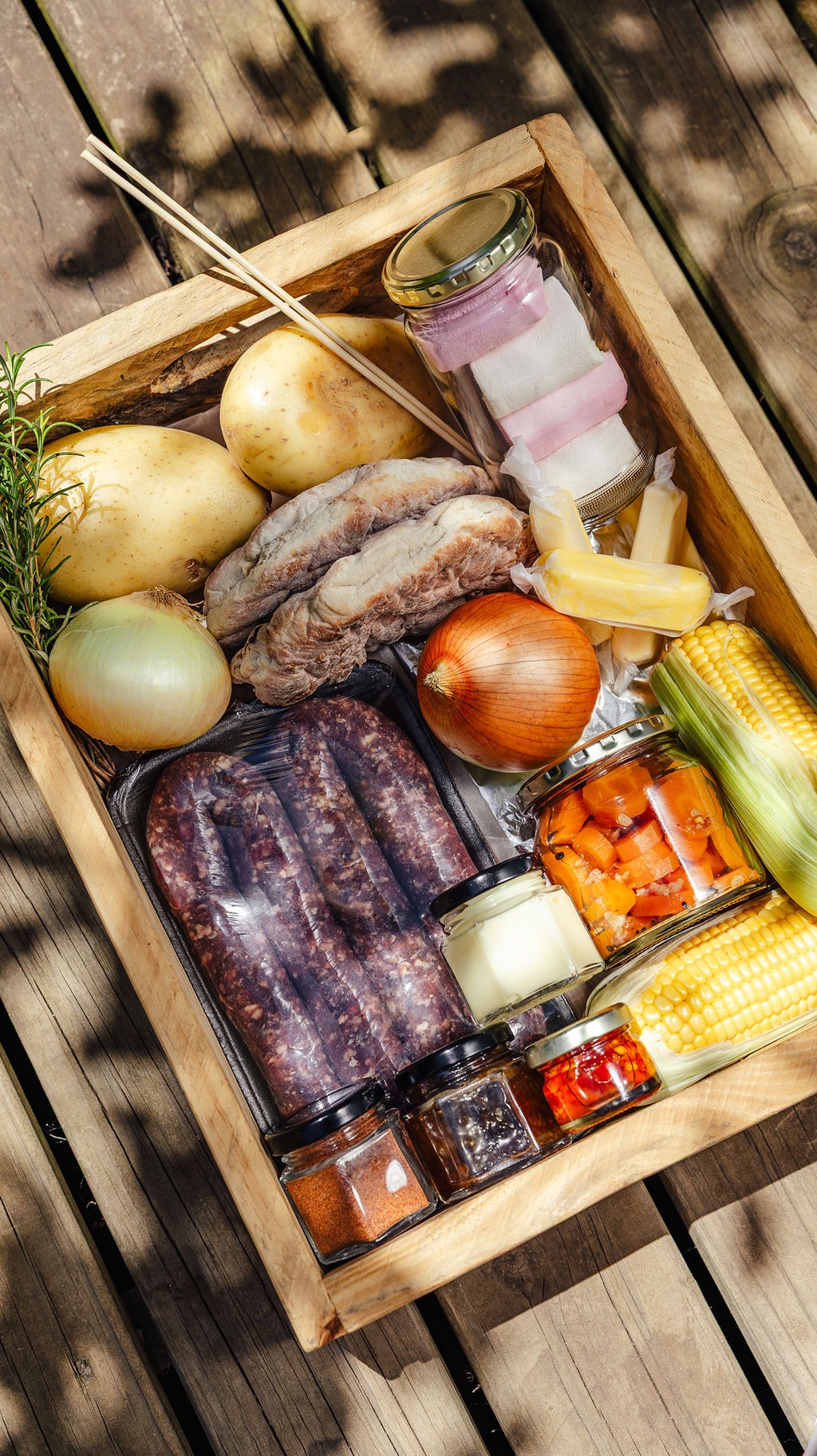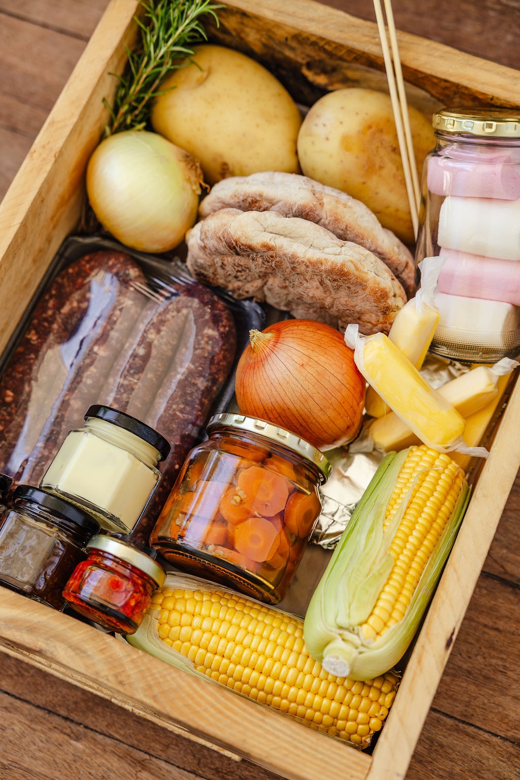 - Our braai boxes to make your life so much easier are filled with: Boerewors, 2 x Garlic butter roostekoek, Chutney, mayo, The Hamlet braai spice, The Hamlet hot honey pickled carrots, butter, and to put over the coals: potatoes, onions, sweetcorn on the cob, and yummy marshmallows for that sweet touch. If you wish to supplement your meats, we have a selection of chicken, steak and chops in the freezer at reception.